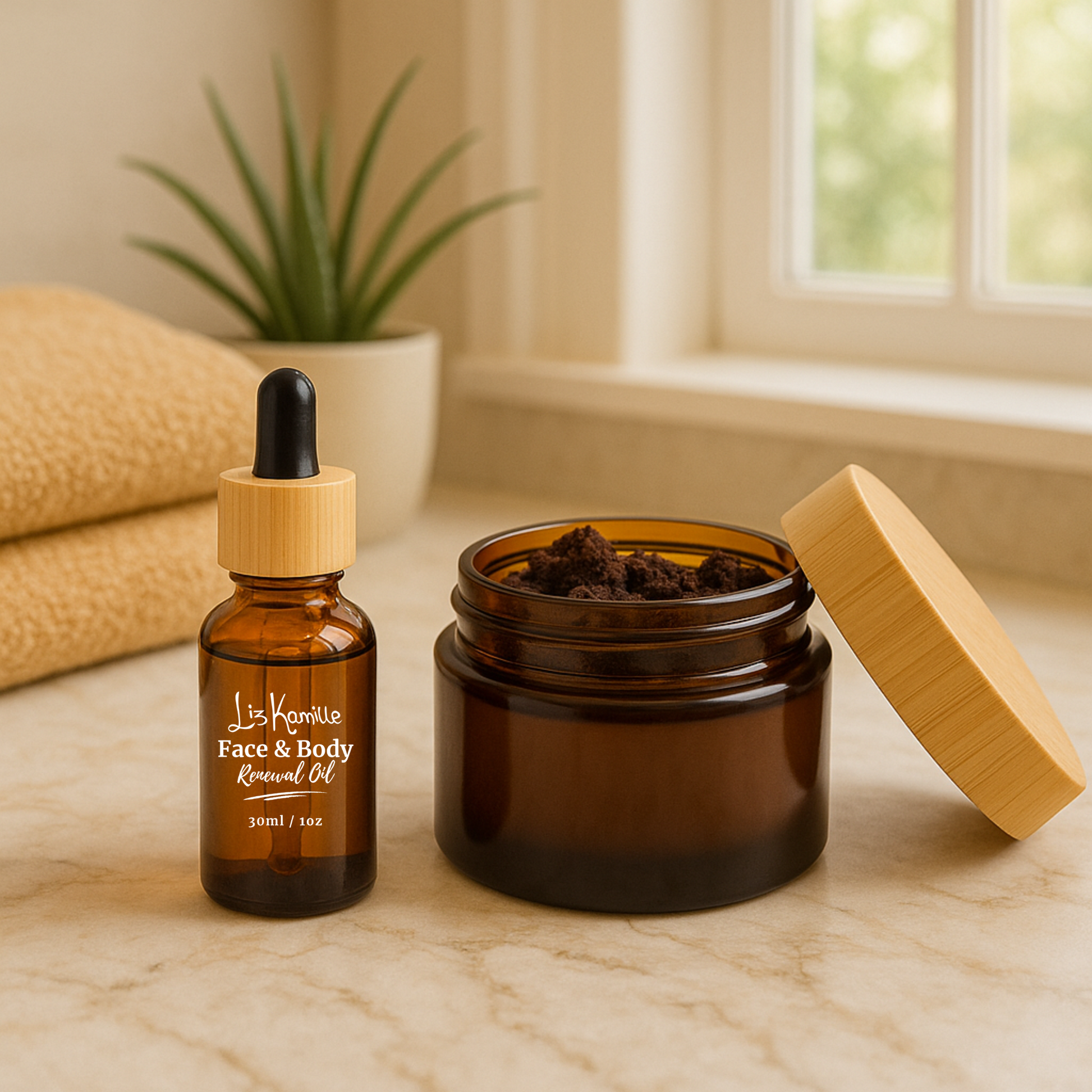 Thoughtfully handmade, the Liz Kamille Signature Skin Set pairs our indulgent Coffee Scrub with our deeply restorative Face & Body Renewal Oil — a luxurious duo designed to exfoliate, nourish, and transform your skin.