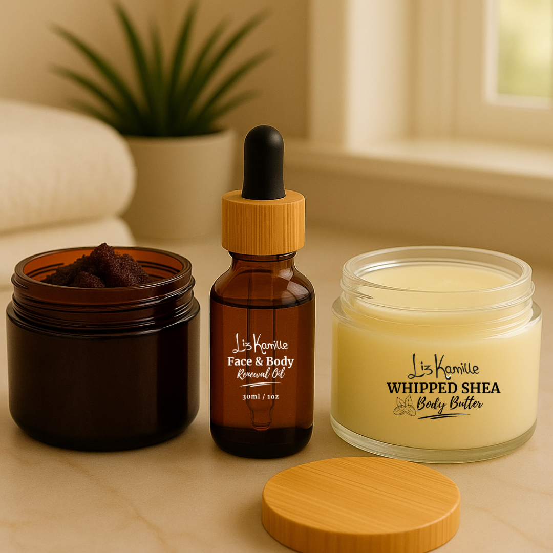 Elevate your skincare routine with this curated trio of must-have products. Our Essentials Set includes our rejuvenating Sugar & Spice Coffee Scrub to polish and refresh, our nourishing Face & Body Renewal Oil for daily hydration, and our Whipped Shea Body Butter to lock in moisture.